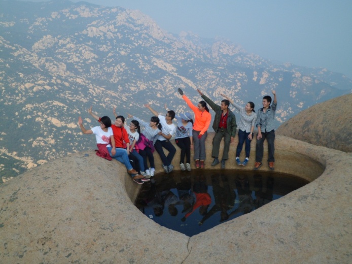 转坐两次公交车后,早上8点,队员们到达崂山长岭村。从这里出发,经过天心池、天茶顶即到达巨峰,全程约20公里。大家个个精神抖擞、意气风发,朝着山顶奋力前进。由于山势陡峭,路途艰辛,经过4个多小时的努力,所有成员顺利到达了天心池,大家在欢声笑语中一起合影以示庆祝和纪念。站在山顶放眼望去,此时山峦起伏,薄雾渺渺,海天一线,美不胜收。大家一起饱览秀美秋色,体验不畏艰险、顽强拼搏、勇攀高峰的登山精神。